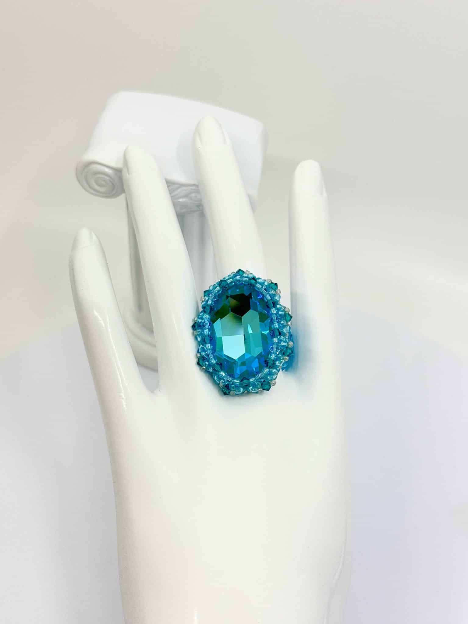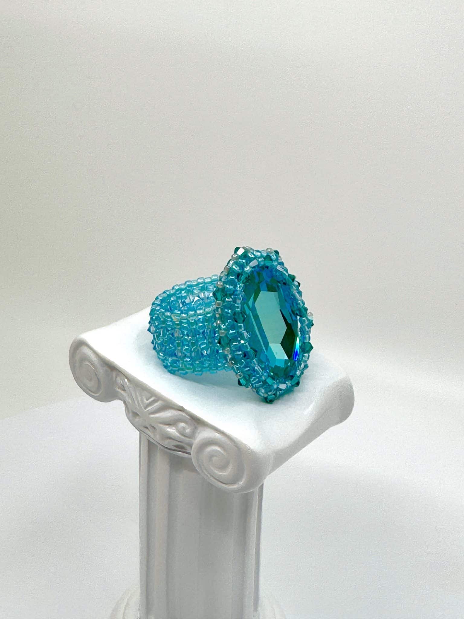 Autour du cabochon, les toupies Swarovski de 3 mm ajoutent un scintillement subtil qui enrichit encore l’ensemble. Leur luminosité s’accorde harmonieusement avec le tissage en perles Miyuki, précises et parfaitement régulières. Par conséquent, la bague combine solidité, confort et sophistication.