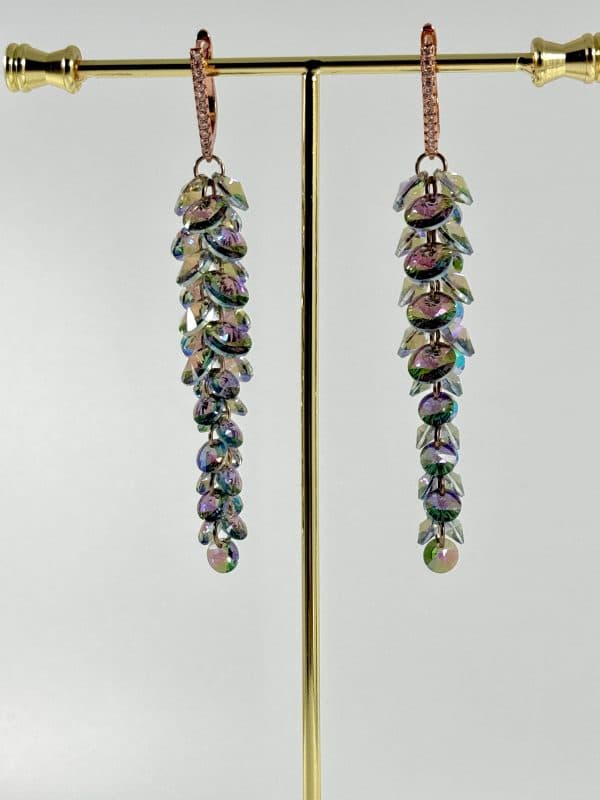 Boucles d’oreilles en cristaux autrichiens Cascade d’Aurore, pendants lumineux de 6 et 8 mm avec zircons cubiques. Bijou artisanal élégant, longueur 8 cm, idéal pour illuminer une tenue de soirée ou un look raffiné au quotidien.