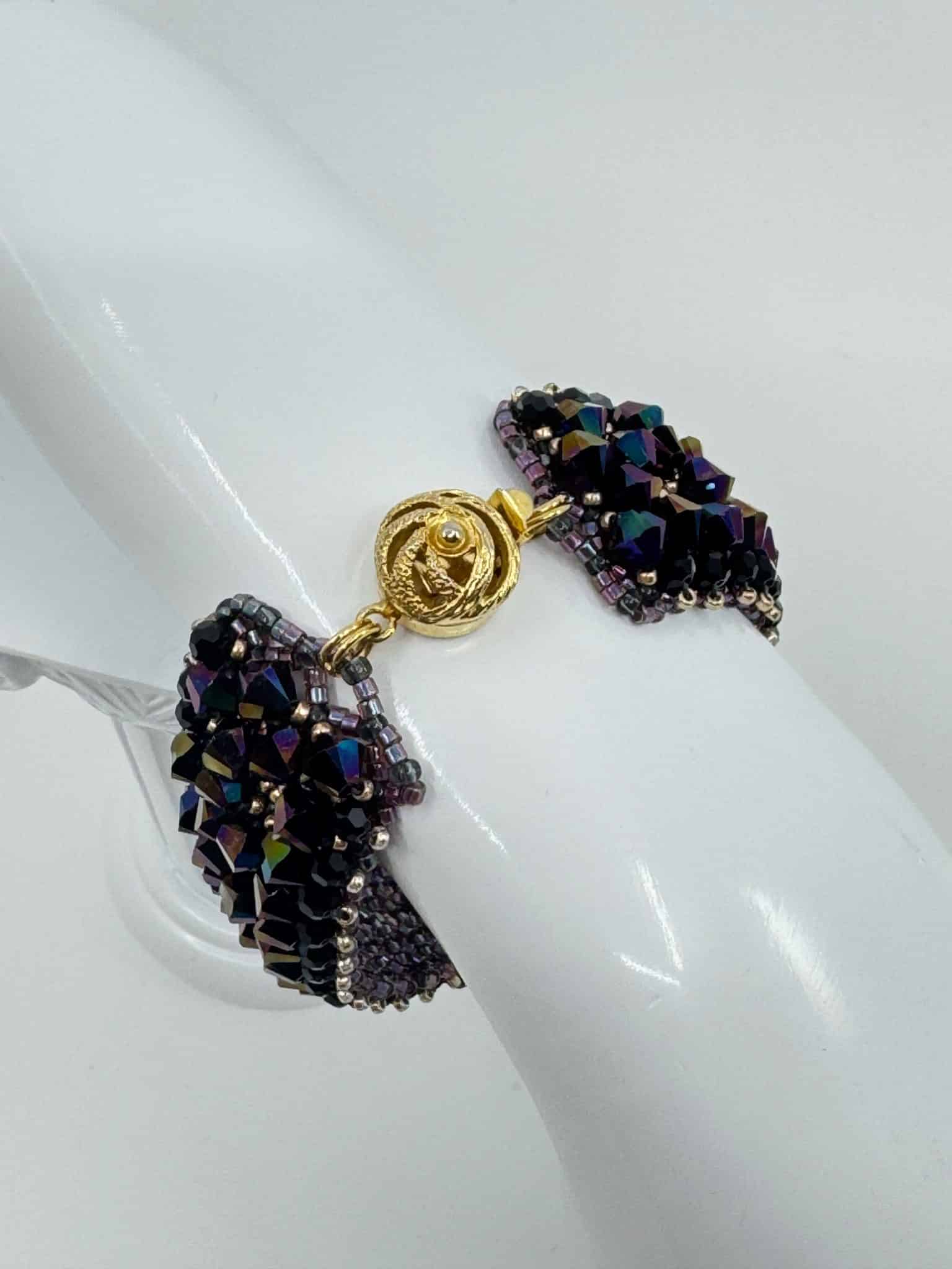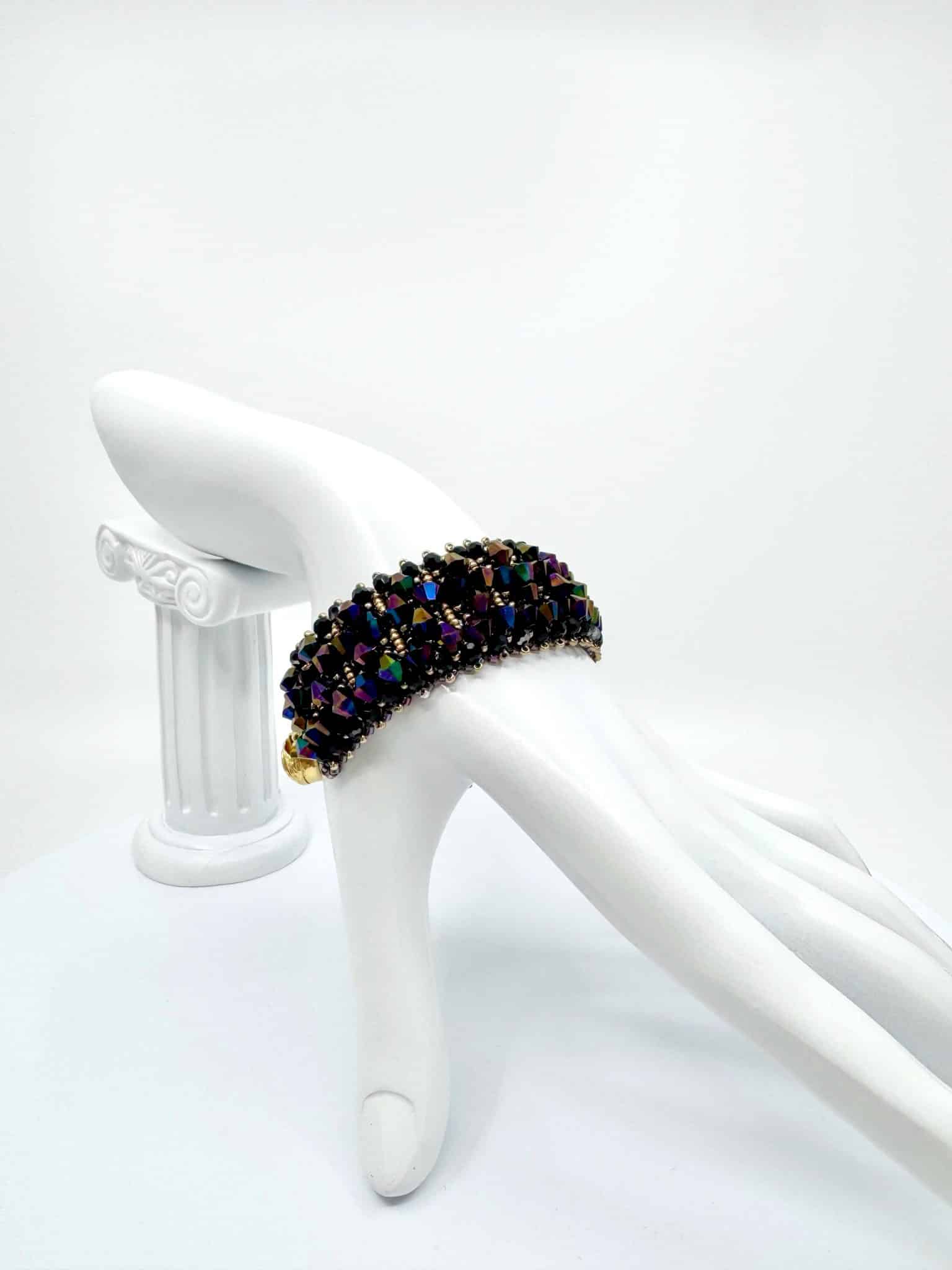 Le bracelet Éclipse Noire est une pièce artisanale d’exception, créée pour celles qui recherchent un bijou à la fois élégant, moderne et lumineux. Réalisé avec des toupies Swarovski®, réputées pour leur brillance incomparable, ce bracelet attire le regard sous tous les angles. Les nuances irisées des cristaux se marient harmonieusement avec les perles japonaises Miyuki, offrant un contraste subtil et raffiné.