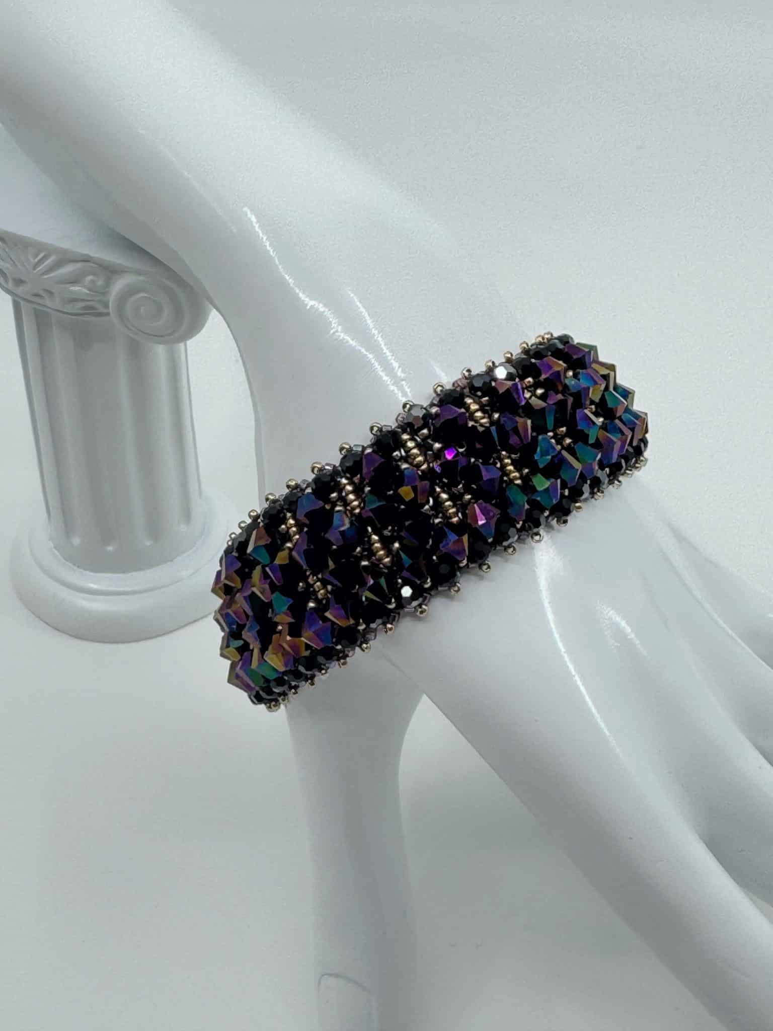 Chaque élément du bracelet est tissé à la main avec précision. Ainsi, chaque perle est soigneusement positionnée afin d’obtenir un rendu équilibré et une structure parfaitement régulière. De plus, la combinaison des perles rondes et des toupies en cristal crée un relief sophistiqué qui donne au bijou un caractère luxueux.