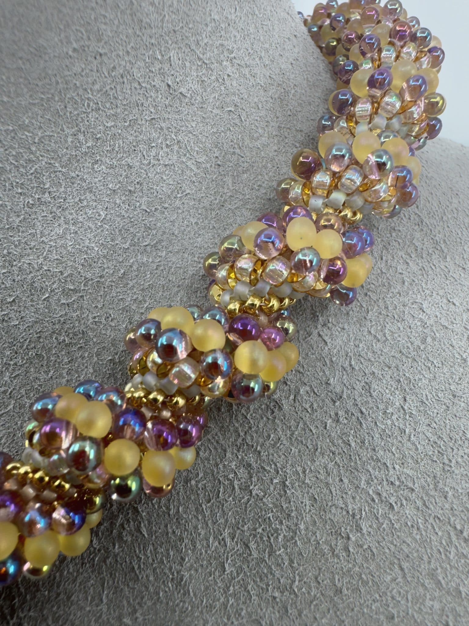 Le collier est composé de perles japonaises Miyuki en forme de mini-gouttes de 2,8 mm, soigneusement tissées pour former une spirale fluide et régulière.