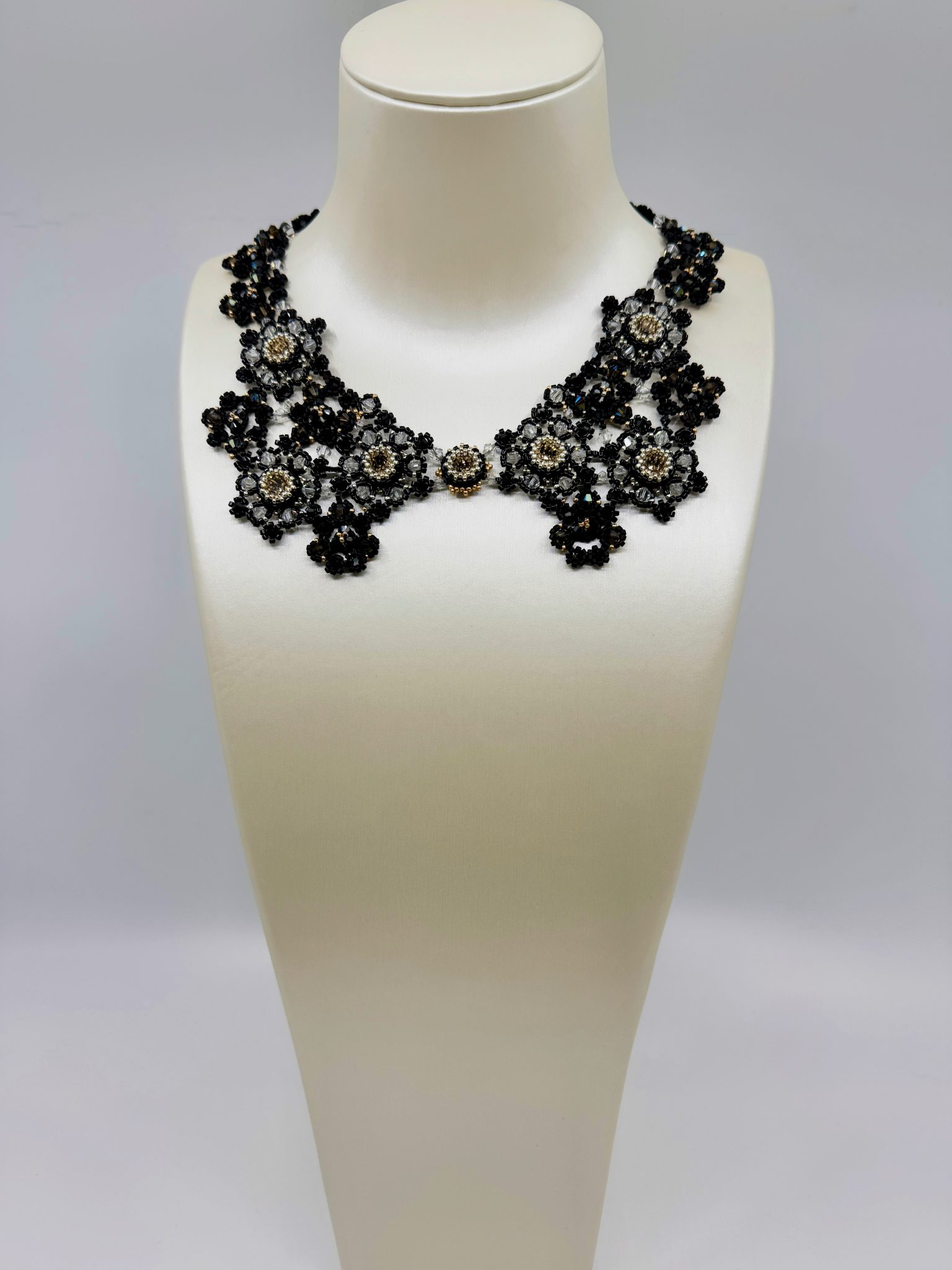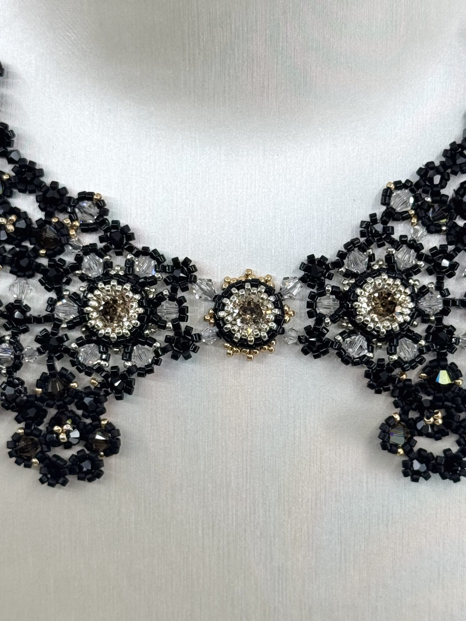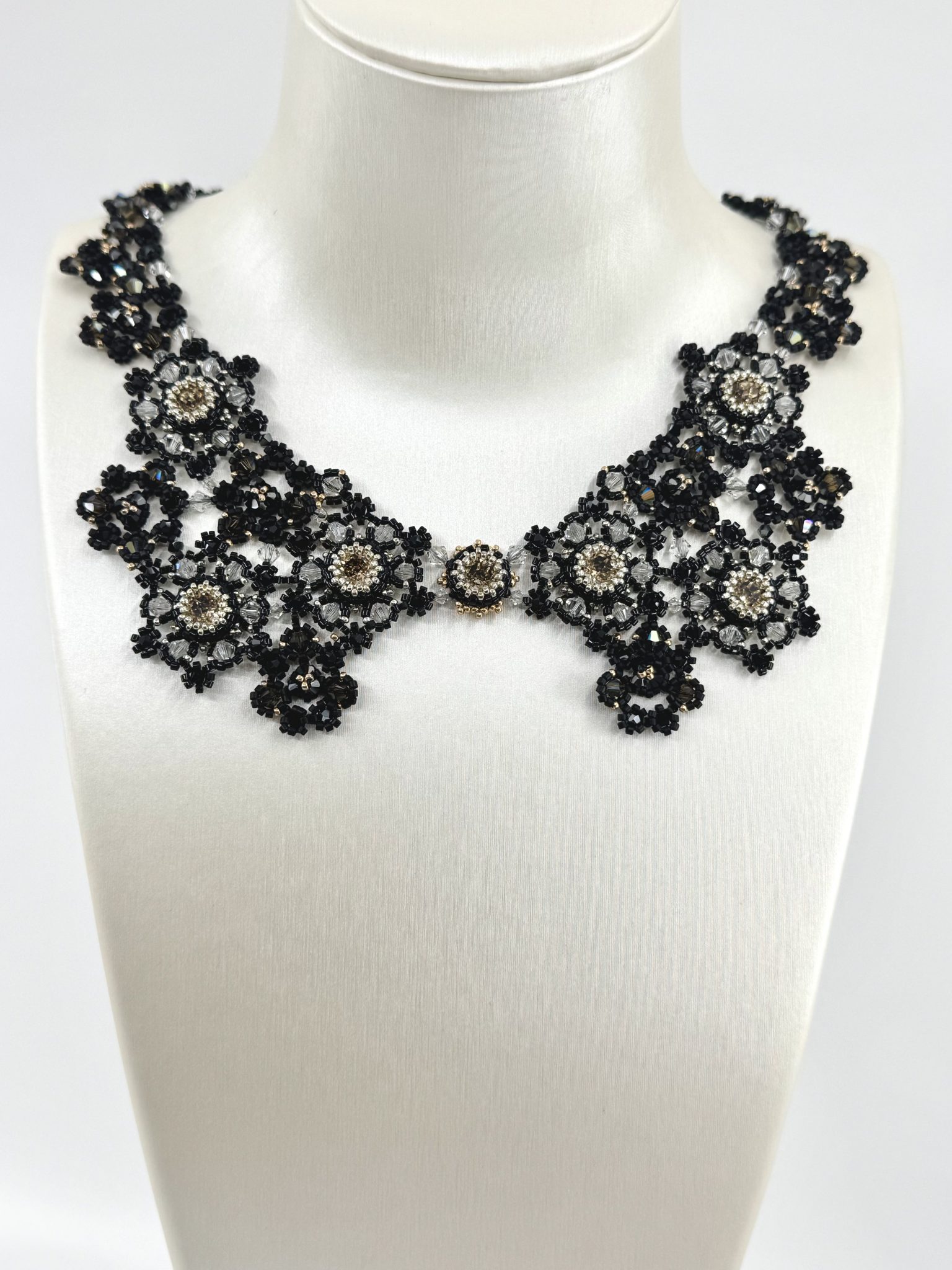 Ce collier unique a demandé 41 heures de travail minutieux. Chaque perle, chaque cristal a été posé à la main. Enfin, cette patience donne naissance à une pièce exceptionnelle, qui ne peut être reproduite à l’identique.
