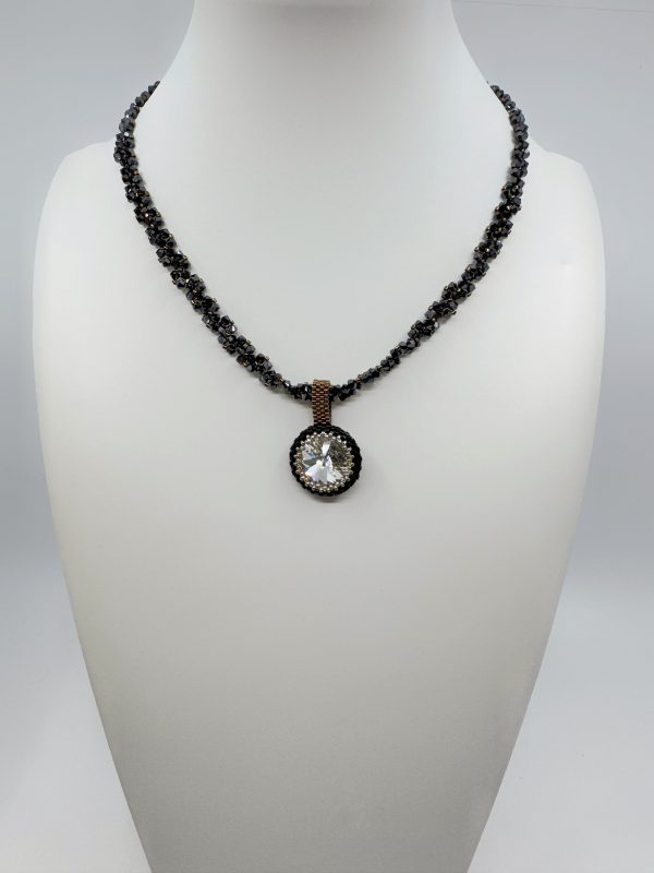 Le Collier Éclipse en cristaux autrichiens capte le regard par son contraste raffiné : une tresse de perles sombres façon hématite met en majesté un Rivoli en cristal autrichien 16 mm aux reflets champagne. Ainsi, chaque mouvement révèle une lumière subtile, à la fois moderne et intemporelle.