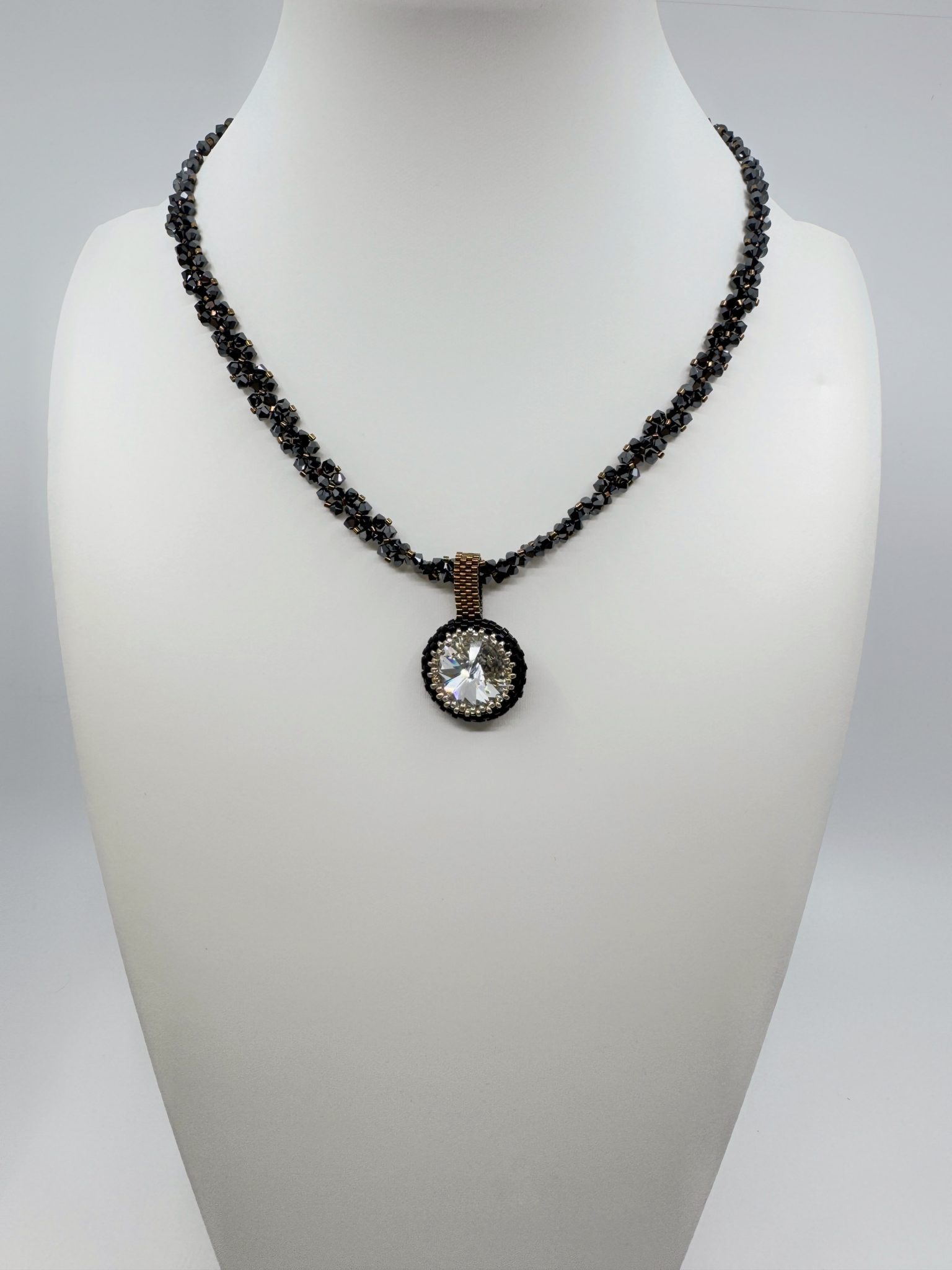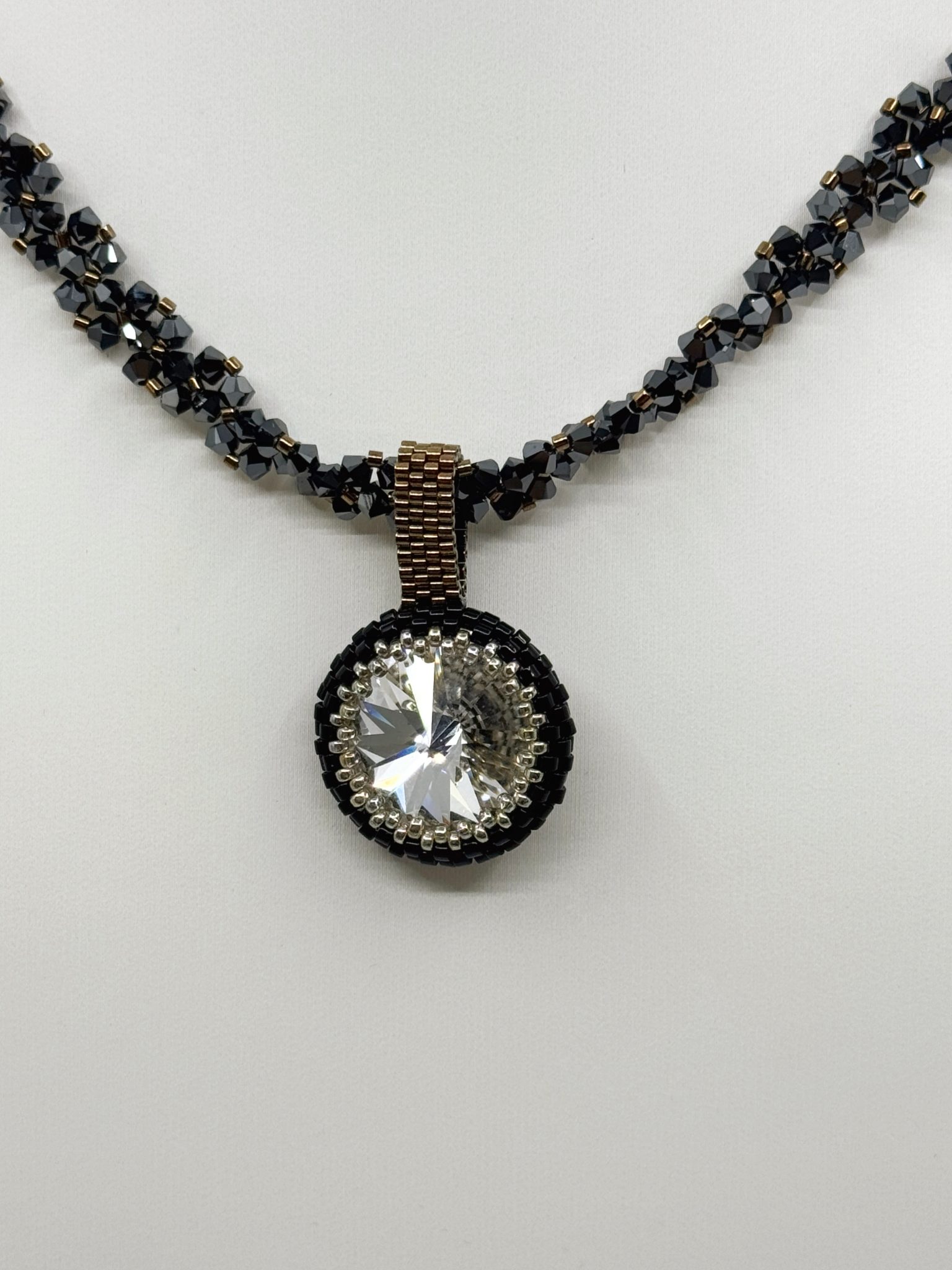 Détails : perles Miyuki, toupies Swarovski® 3 mm, Rivoli Swarovski® 16 mm, longueur 45 cm, fabrication artisanale.