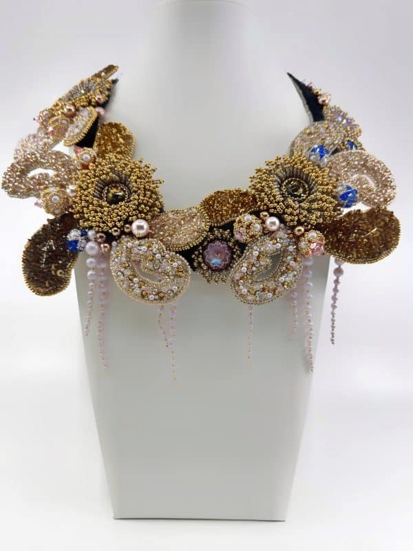 Ainsi, chaque élément est brodé à la main selon un savoir-faire précis, faisant de ce collier une véritable pièce haute couture