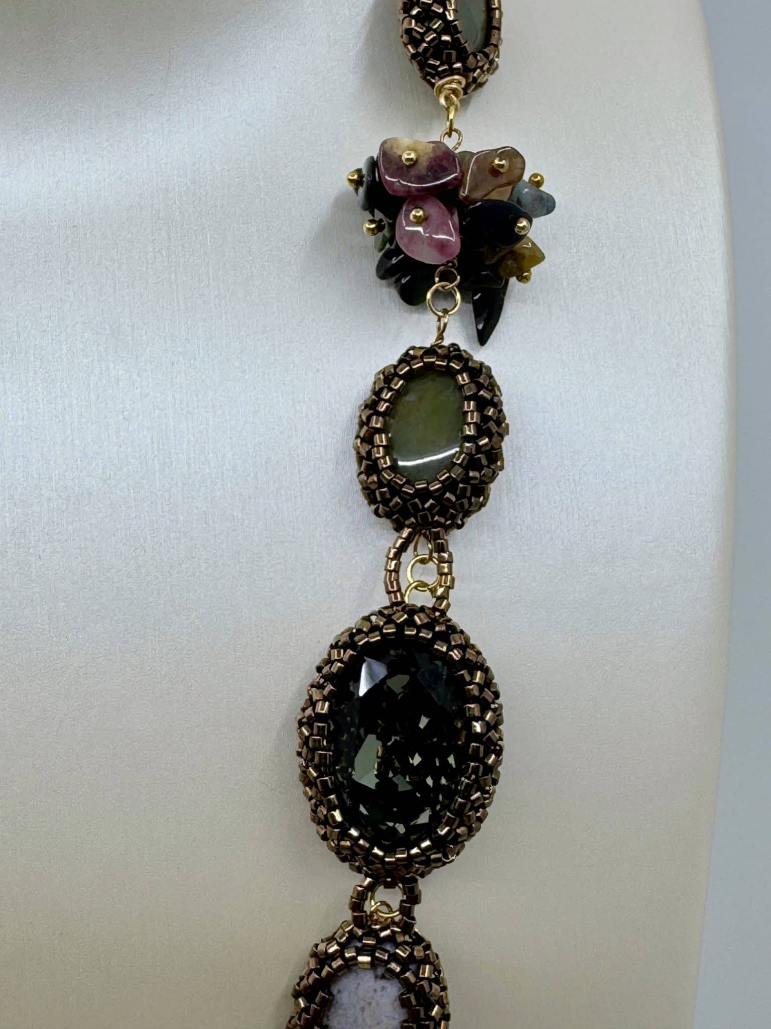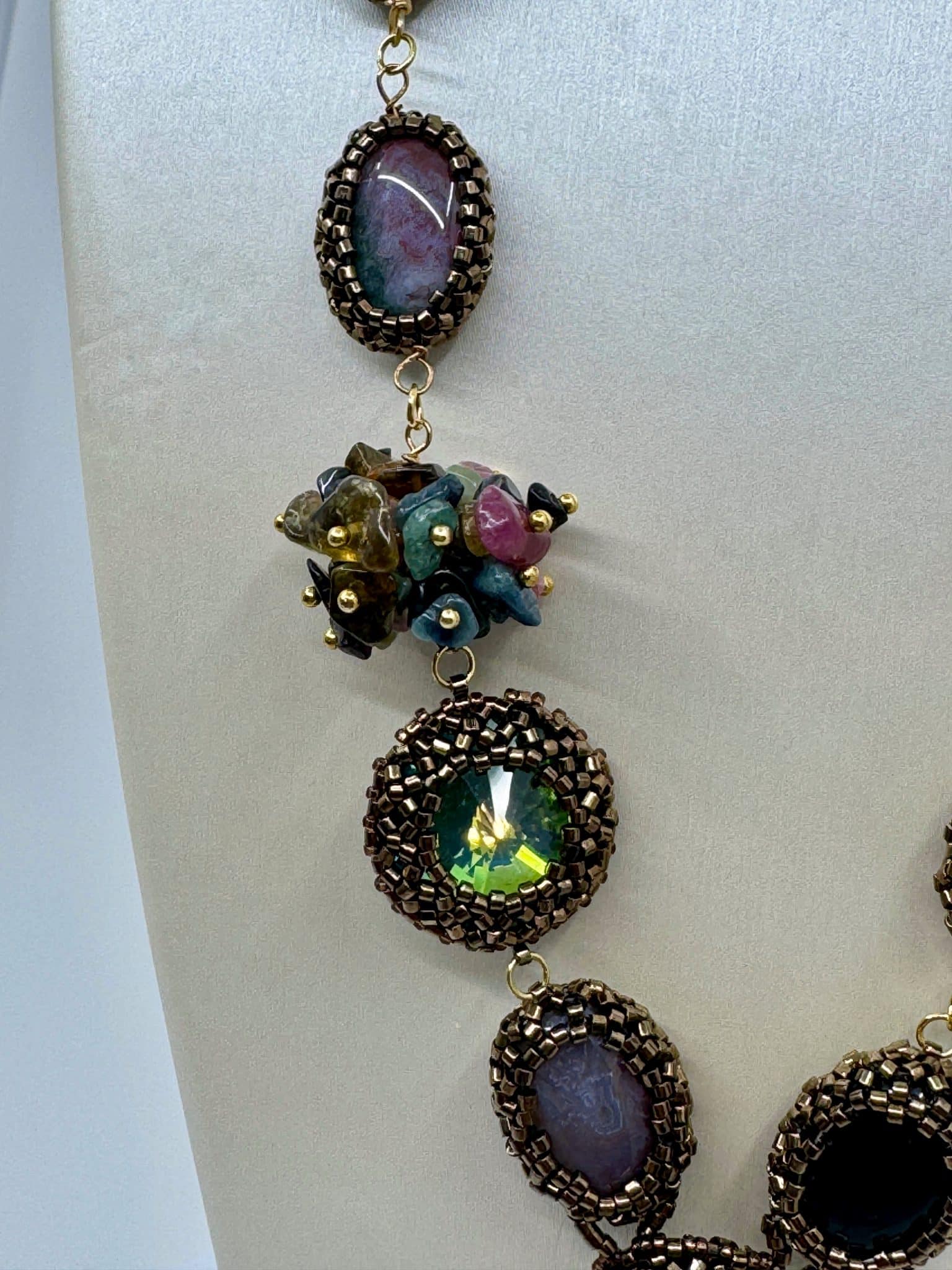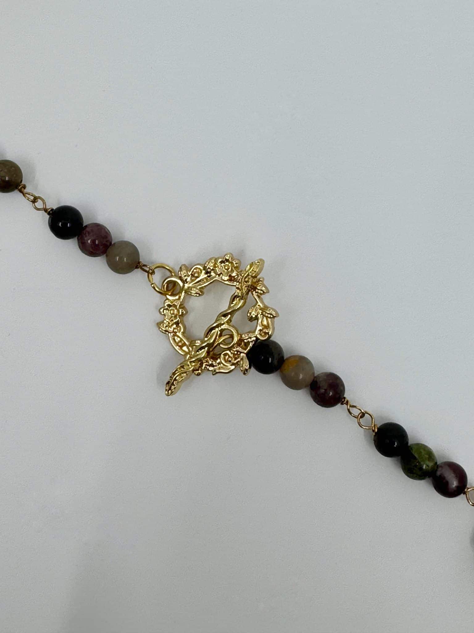 Les pierres de tourmaline ajoutent des touches de couleur vibrantes. Leur palette naturelle crée un contraste subtil avec l’agate plus sombre. Ainsi, le collier gagne en richesse visuelle et en charme authentique.