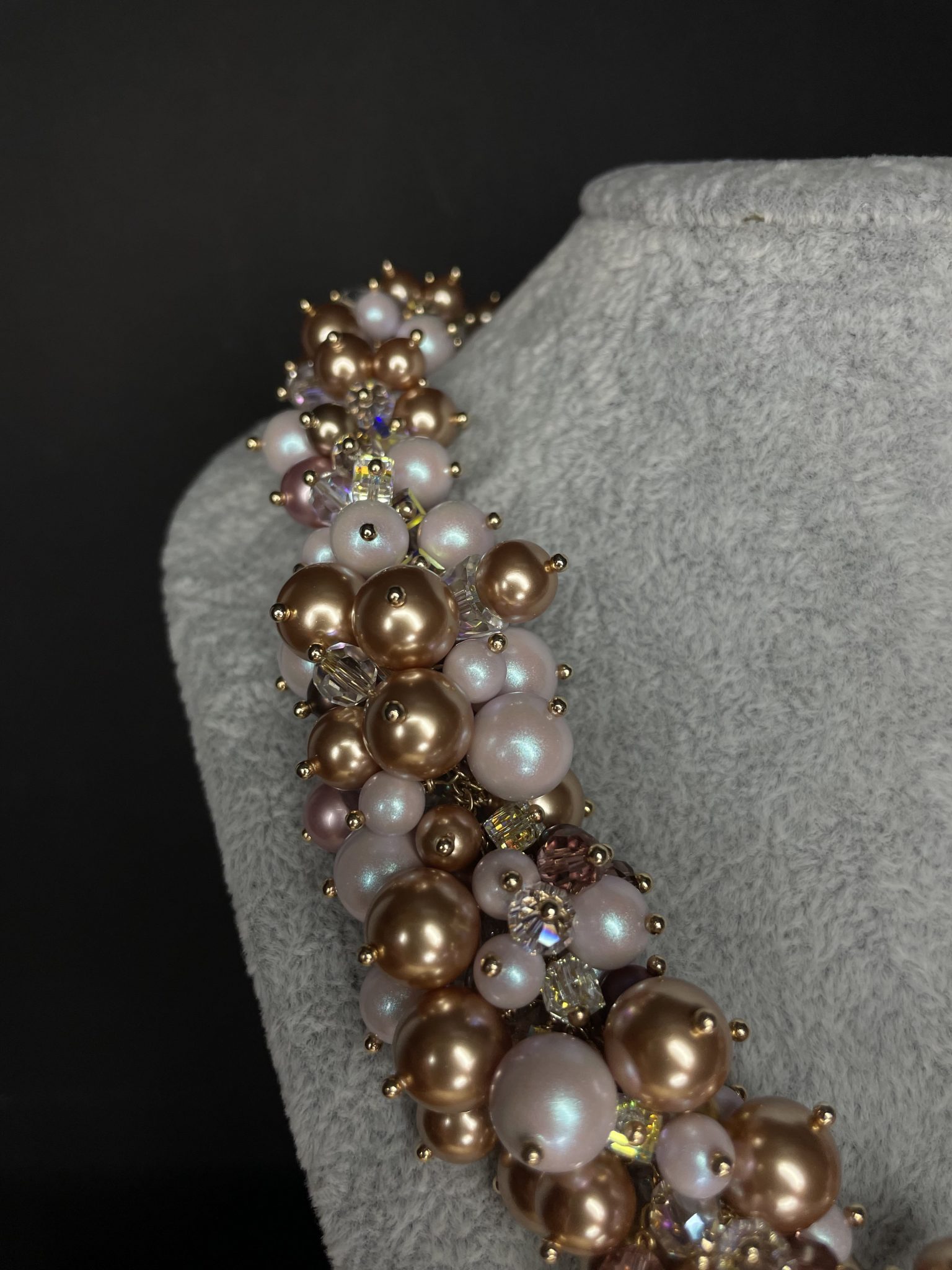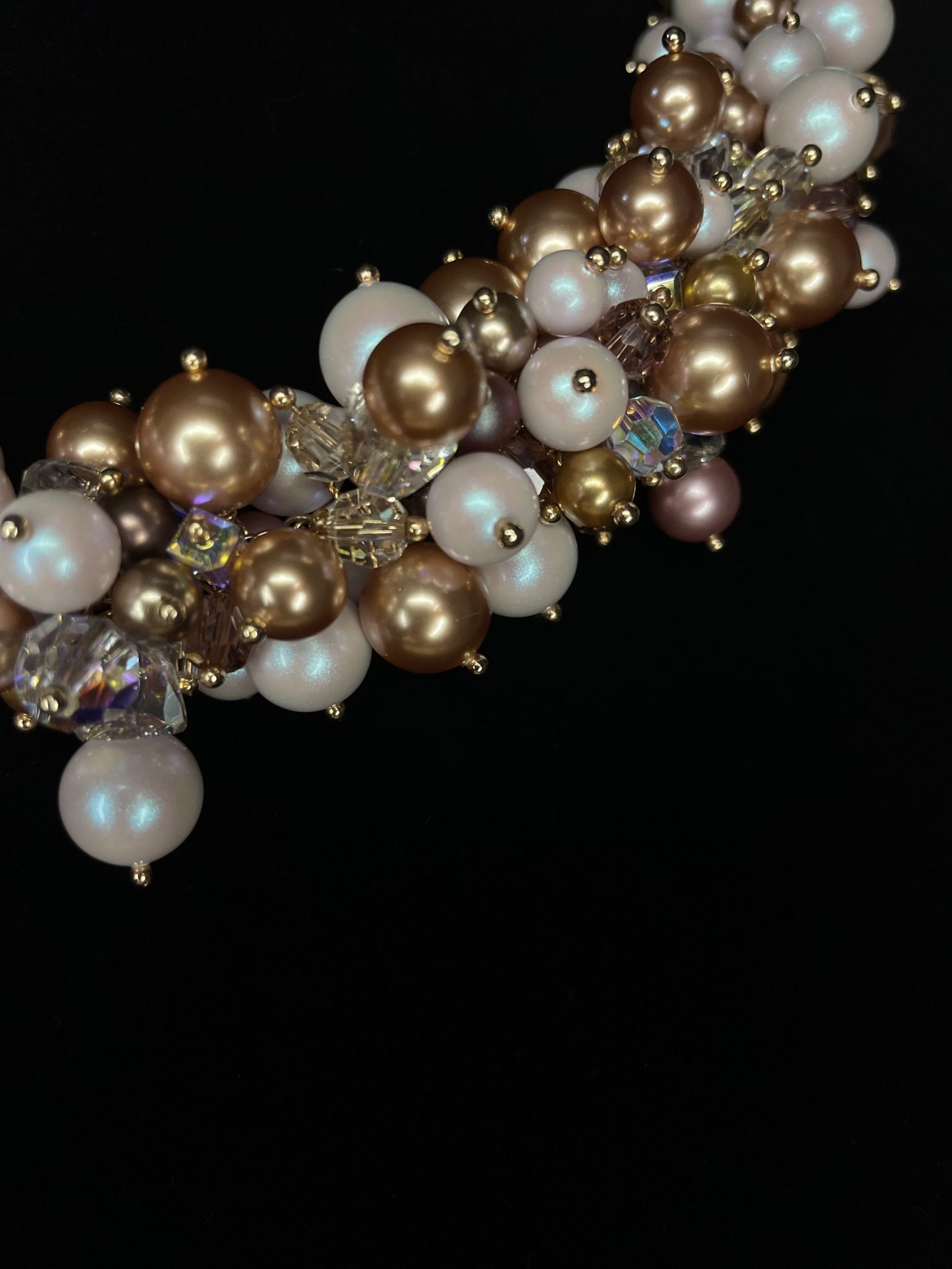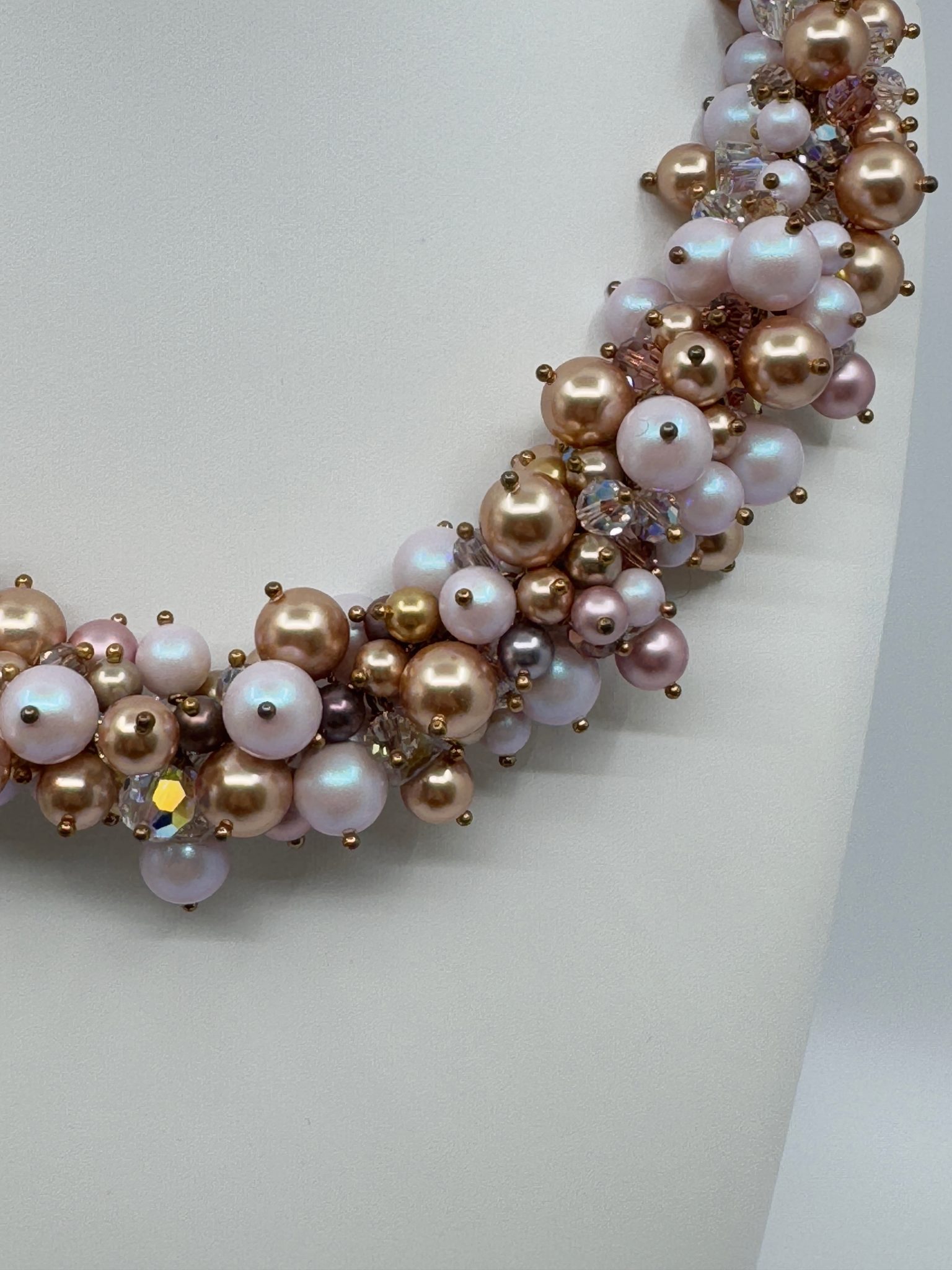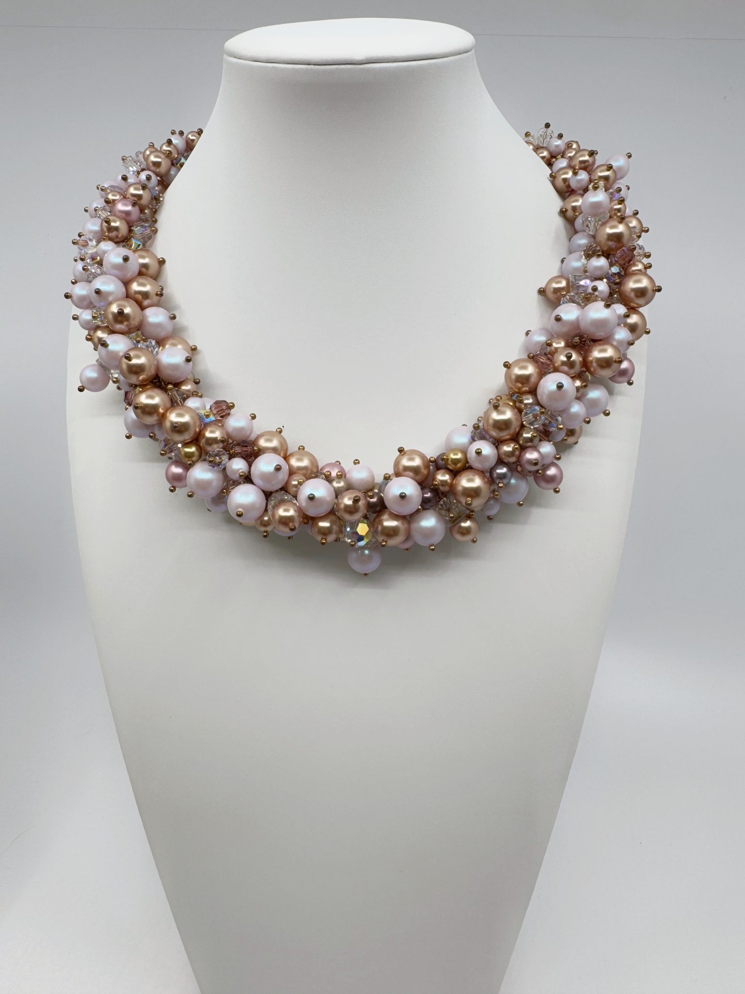Le jeu subtil entre les perles dorées, rosées et blanches crée un relief délicat, comme une cascade de lumière. Enfin, la texture douce et la brillance satinée des perles Swarovski offrent une touche de luxe et de douceur. Ce collier fait main symbolise la féminité, la tendresse et la sophistication à l’état pur.