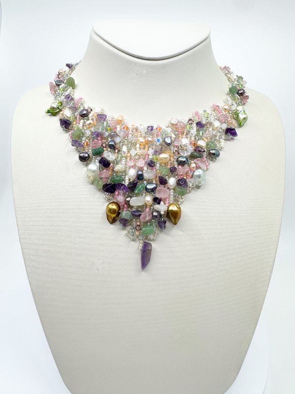 Ce collier est composé de brisures de pierres naturelles sélectionnées une à une : améthyste, quartz rose, aventurine, jade, cristal de roche et autres minéraux. Leur texture brute apporte un charme organique et authentique. De plus, chaque pierre posséderait ses propres vertus énergétiques, ce qui confère au collier un caractère spirituel distinctif.