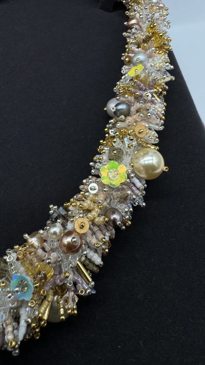 Le collier Sable doré est une création unique qui allie la chaleur des teintes dorées à la douceur des perles de culture et l’éclat des cristaux autrichiens. Fait main en France, ce bijou reflète le raffinement intemporel et offre une touche lumineuse à toutes vos tenues. Que vous le portiez pour une occasion spéciale ou pour illuminer votre quotidien, ce collier sublime le style et la féminité.