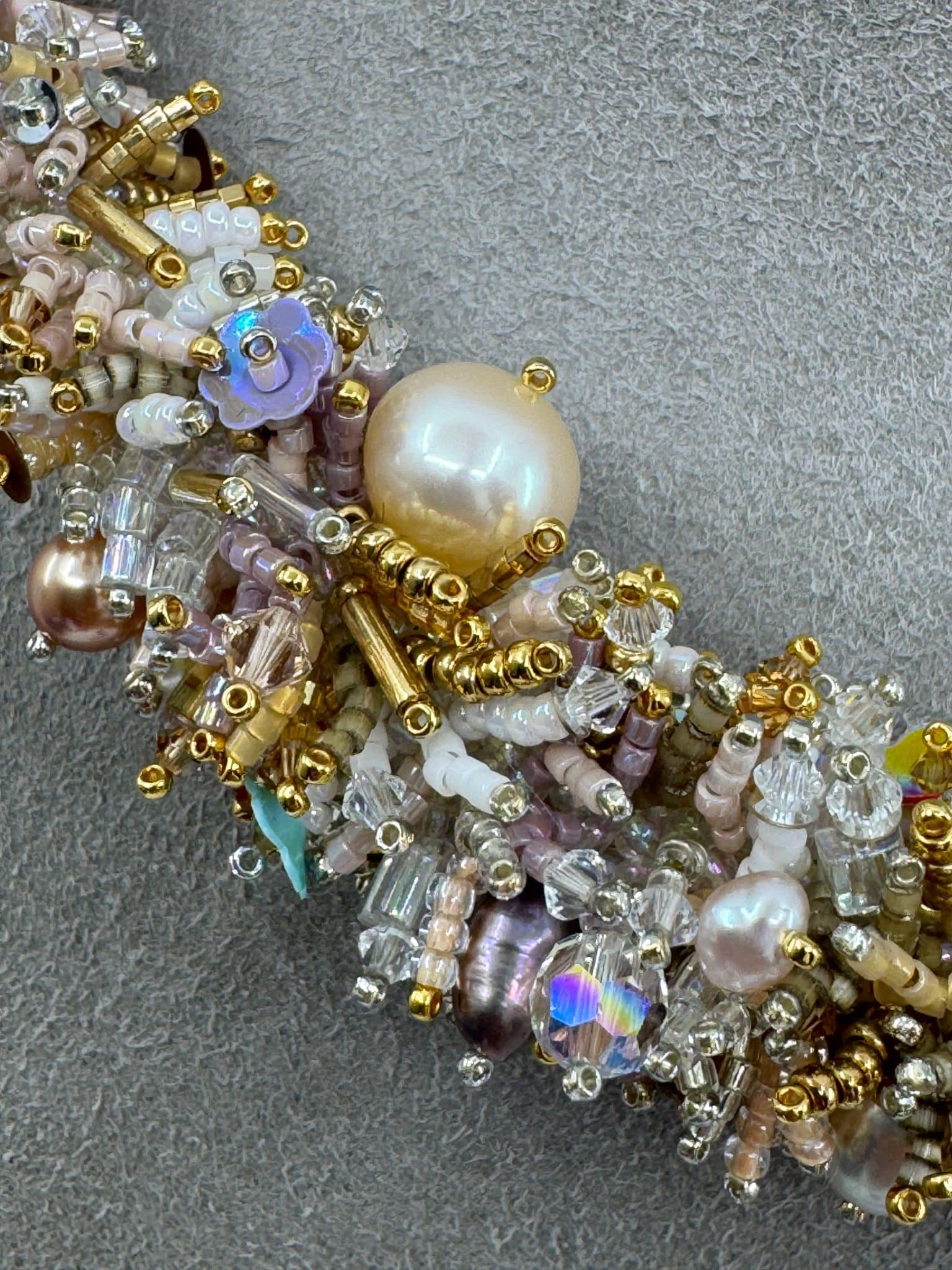 Matériaux : perles de culture, perles japonaises Miyuki, bicons cristaux autrichiens